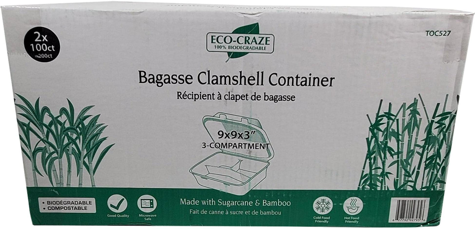 Eco-Craze - Contenant à charnière en bagasse - 9X9 - 3 compartiments